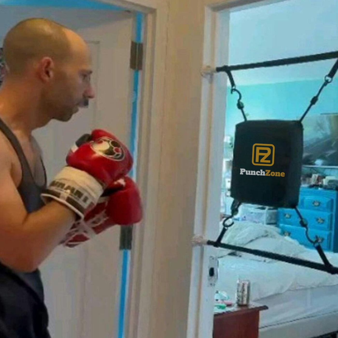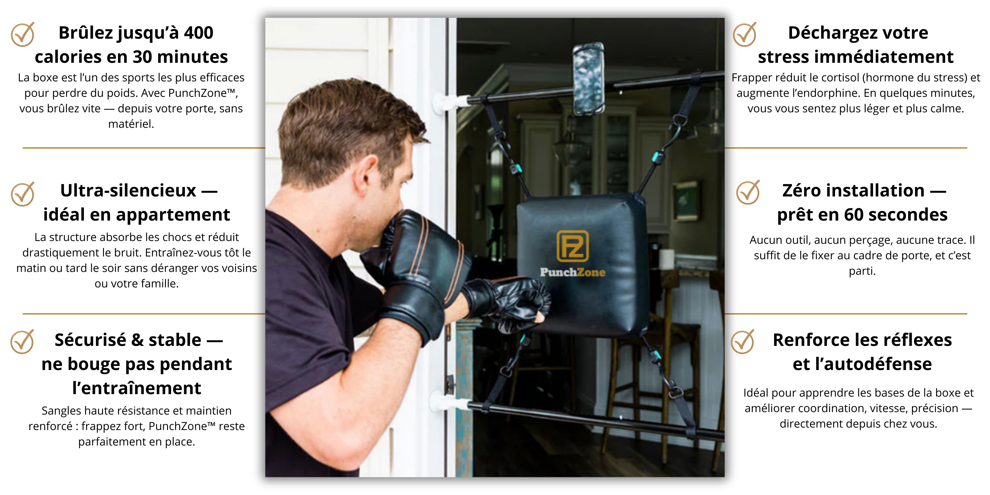 Aucune préparation, aucun trajet à la salle. PunchZone est prêt à l’emploi en moins de 60 secondes dans votre cadre de porte.